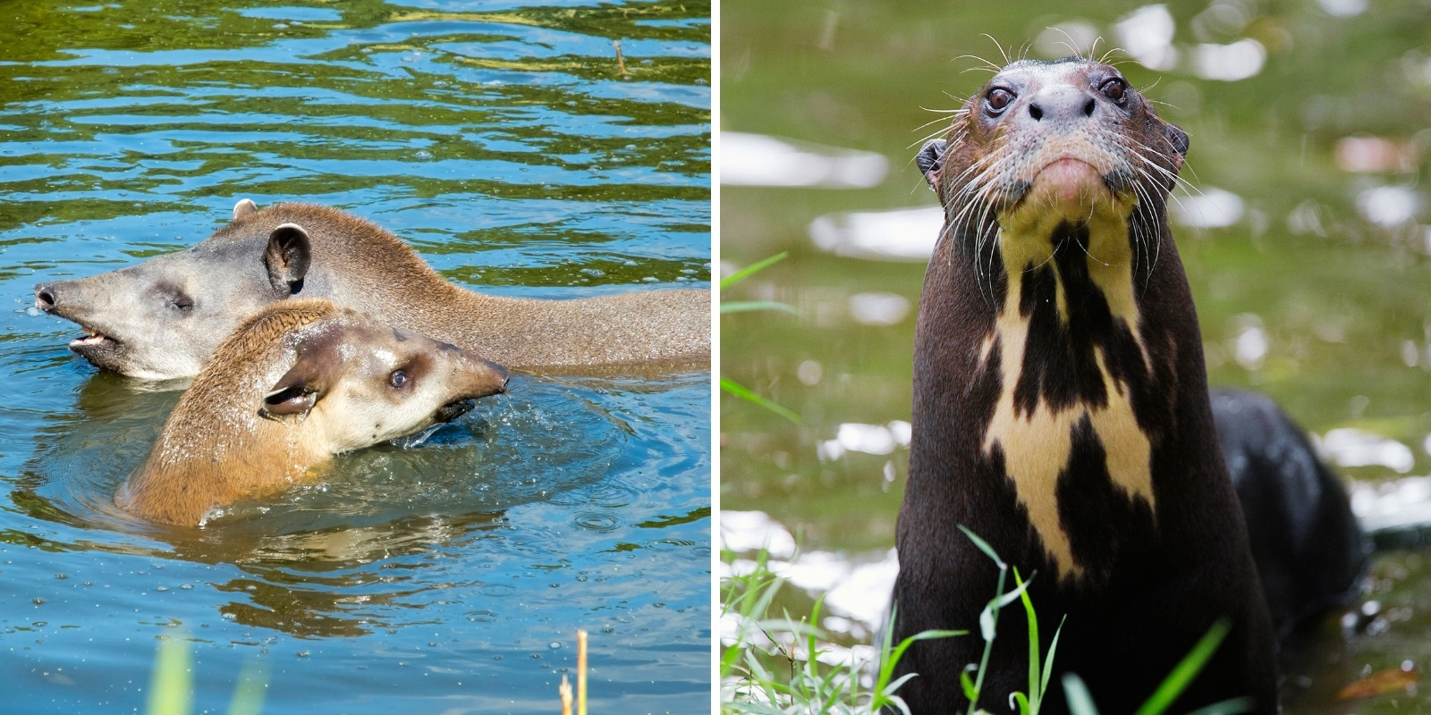 Giant river otter (Pteronura brasiliensis): Known in Peru as the giant river otter, this is the world’s largest mustelid and one of the most charismatic predators in the Amazon. Endemic to the rivers and lagoons of the Peruvian lowland rainforest, such as Madre de Dios and Loreto, it is distinguished by its size (up to 1.8 meters), its brown fur with white markings on the throat, and its social behavior, living in family groups of up to 10 individuals. A key species in the ecosystem, it regulates fish and caiman populations, but is endangered due to poaching (for its fur in the 20th century), habitat loss, and mercury contamination.
